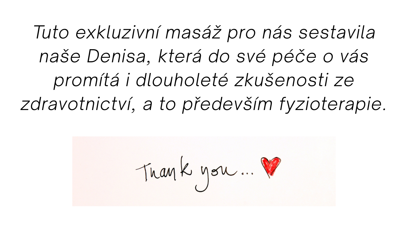 je naše unikátní kosmetická masáž, která citlivě propojuje relaxační techniky s fyzioterapeutickými tahy.